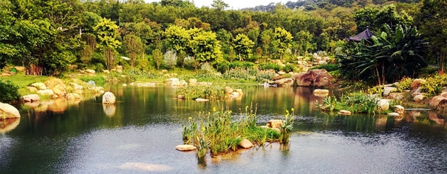 芳池位于青秀山風景區蘭園東北側,與蘭湖相距200m,處于一塊緩坡地帶。總平圖面積近似14000m2,由南向北被人為分割為4塊水池,水深在1-2m之間,各水池間被攔水景觀石、連岸等造景人為分隔,由池1經池2、池3、池4依次呈現水位下跌陣勢。施工后,水體清澈見底,沉水植物生長旺盛,各項水質指標均達到Ⅲ類水以上標準。